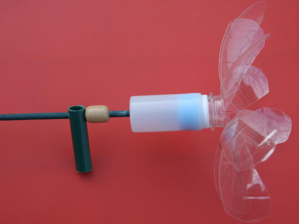 Reste à empêcher l’hélice de quitter son axe en plaçant soit des bouts de tube plastique sur la tige, devant et derrière ou des billes collées ou coincées à défaut on peut enrouler du ruban adhésif pour faire arrêt. Ci dessous exemple de montage d'une girouette avec bille, boîte de pellicule, bouchon, goulot découpé puis un autre bouchon servant d'arrêt.